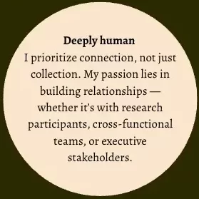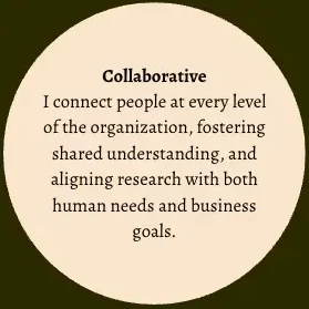 With my 6+ years of experience in research and 10+ years of experience in business, I’ve had the privilege to operate in multiple sectors of industry and gain a deeper, holistic lens to the impact of research within organizations. From usability of interactions within a product to the development and definition of research process and systems, I am able to derive the critical “why” that ultimately fuels meaningful, strategy driven solutions.