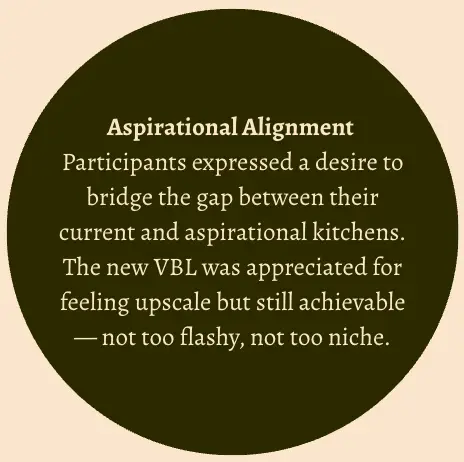 We began by exploring consumers’ ideal kitchen environments through a card-sorting exercise featuring words and images. This helped anchor their aesthetic values and personal preferences before introducing brand or product context.