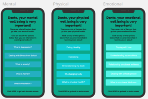 The app interface is a calming green with fun, age appropriate text. The app then gathers the student’s school email, age, identifier, hobbies, and classes. The adolescent would then click on each of the three areas of wellness to delve more into specific topics that they want to get more information about. These three topics include mental, physical, and emotional wellness.